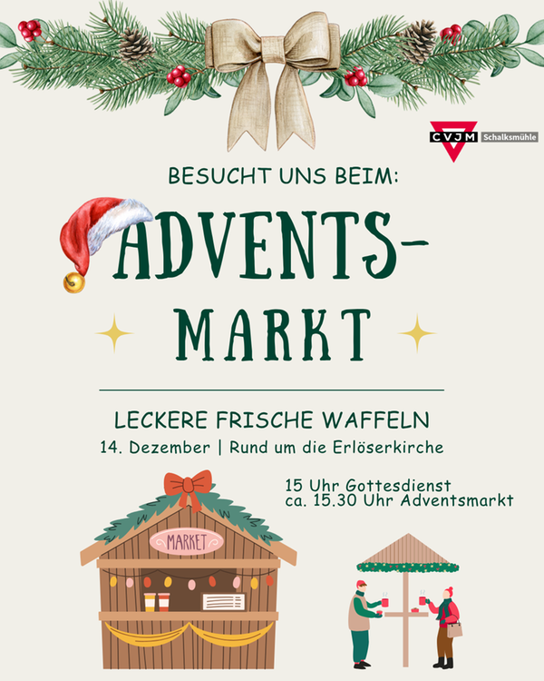 Auch in diesem Jahr wird wieder ein gemütlicher kleiner Weihnachtsmarkt auf dem Kirchplatz der Erlöserkirche am 3. Adventssonntag stattfinden. Unser CVJM wird hierbei erneut mit einem Stand vertreten sein und leckere Waffeln anbieten. Wir werden wieder Waffeln grillen und im Waffeleisen backen. Für die Standbesetzung, sowie den Auf- und Abbau werden noch freiwillige Helfer benötigt. Außerdem sind wir um Teigspenden dankbar. Wir freuen uns schon auf einen tollen Nachmittag mit euch auf dem Kirchplatz und in unserer Hütte. Wenn du Lust hast an diesem Tag zu helfen, dann melde dich gerne bei Larissa.